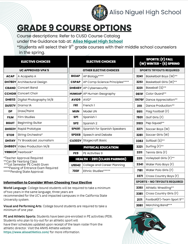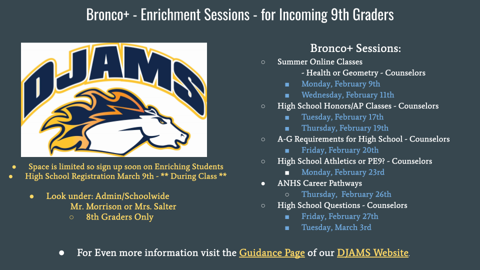 ANHS is excited to welcome their future Wolverines for the next school year. Please see the Registration for incoming 9th graders page on the ANHS website for more information including courses offered and placement guidelines. Students will be working with their 8th grade counselors to sign up for high school classes through their Student Portal Account. Questions? Contact Mrs. Nelson, DJAMS Guidance Tech, lknelson@capousd.org for more information.