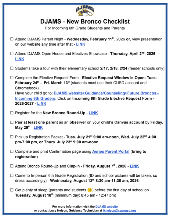 We are so excited for you and your child to join the DJAMS family next school year! While we would have loved to meet you in person, we invite you to experience our new and incoming 6th grade student presentaion online. All incoming and continuing students will request their elective course(s) through an online form located here or on our New Student Enrollment page. We look forward to seeing you in August!